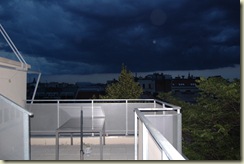 It looks a little more ominous than it turned out to be, and we didn’t get any actual precipitation here with the exception of a few sprinkles. I brought in the chairs anyway, since I’ve discovered that they tend to collect water inside the legs or arms or somewhere, which seems to drip out at the most inopportune times. My guess is the airport folks were waiting for some of the mess to move through Geneva before letting any planes off the ground. We’re OK with that.